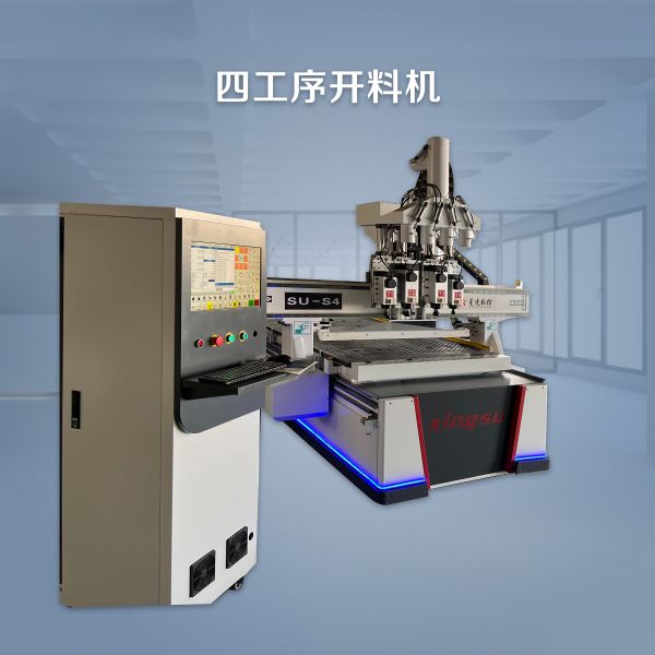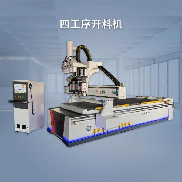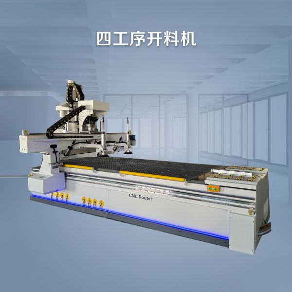 四工序數(shù)控開料機機器機頭部搭載四個主軸,在加工櫥柜時主軸上裝載的刀具分別為6mm,8mm,10mm,15mm。在打孔時四個主軸氣動切換來解決所需孔位,在開槽和開料兩個裝載6mm刀和8mm刀的主軸進行加工. 同時四工序開料機也可以實現(xiàn)簡單吸塑門板造型的加工。所以,四工序開料機建議剛開始干家具廠的客戶選擇,投資預算比較低,搭配側(cè)孔機產(chǎn)量也可以滿足前期的加工量的需求。